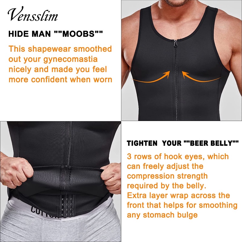 Vensslim Men Shapewear Slimming Body Shaper Compression Shirt with Zipper Tummy Control Waist Trainer Sweat Sauna Corset
